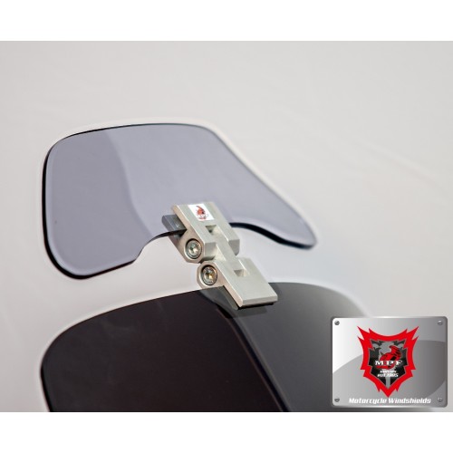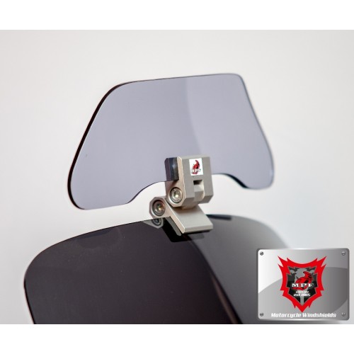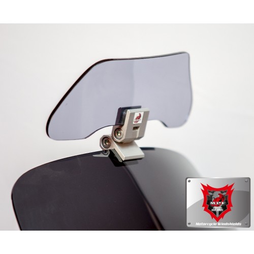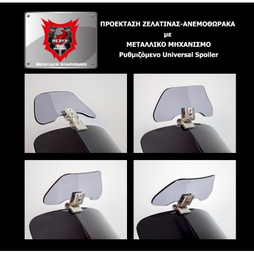 Ρυθμιζόμενο Universal Spoiler ζελατίνας (προέκταση ζελατίνας με μεταλλικό βραχίωνα),επιπρόσθετη προστασία από αέρα έντομα σκόνη και στροβιλισμό με τη νέα κατασκεύη μας.Ο συγκεκριμένος ανεμοθώρακας αποτελλείται από μεταλικό βραχίωνα και το Flap από Plexiglass.Ο μεταλλικός βραχίωνας είναι ασημί χρώματος, από ανοδιωμένο αλουμίνιο,ταιρίαζει σε σχεδόν όλους τους τύπους μοτοσυκλετών και προσαρμόζεται σε ζελατίνες πάχους από 3 εώς 5 χιλιοστών(mm).